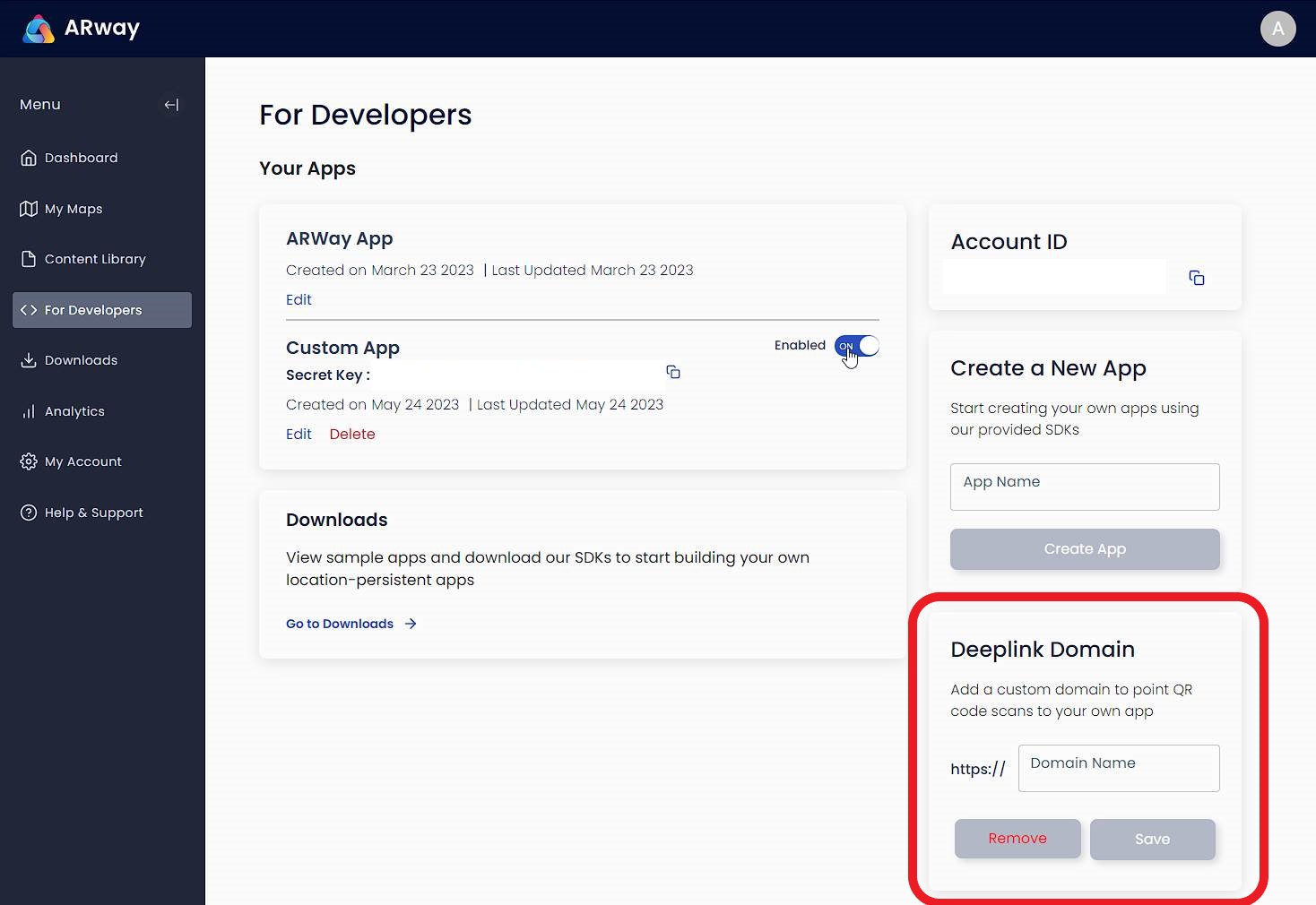 The Deeplink Domain feature allows you to add a custom domain to QR codes downloaded from the ARway Creator Portal. You can easily set up a new domain or revert to the default settings whenever needed. Let's get started!