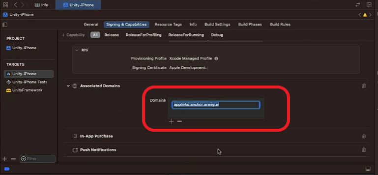 6. Add your domain link, like `applinks:www.yourdomain.com`.