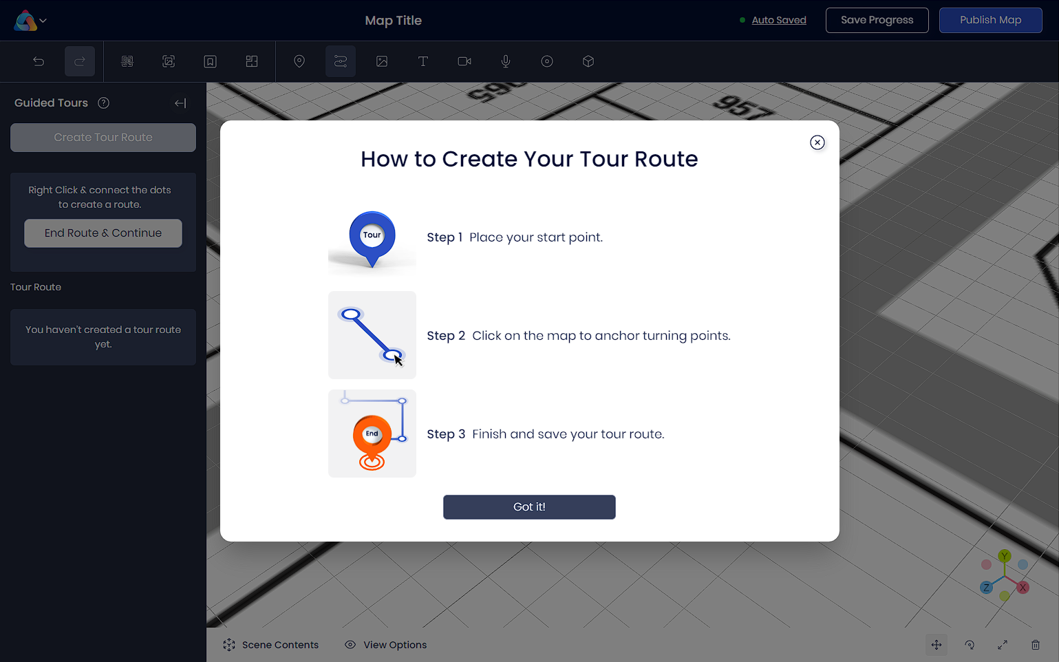 Create a guided tour in the creator portal and customize the experience with multi-color selection. Once created, the guided tour will appear on the spatial map for the end-user as a life-scale virtual pathway.