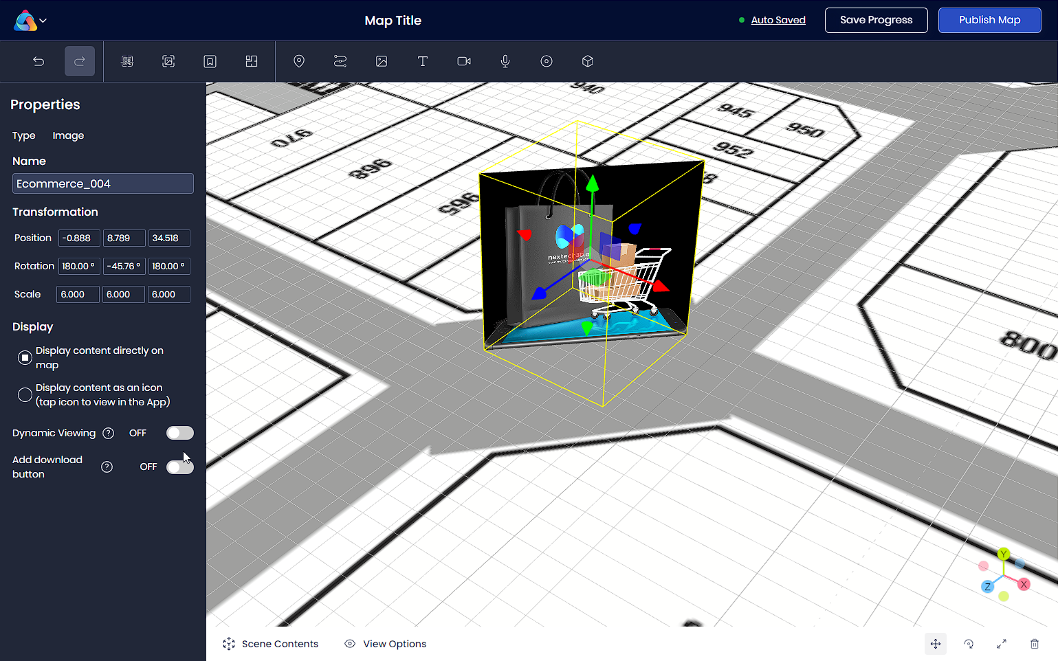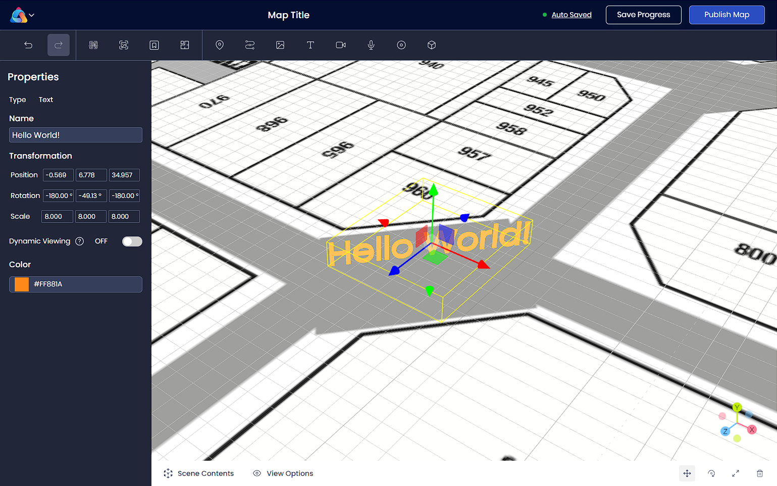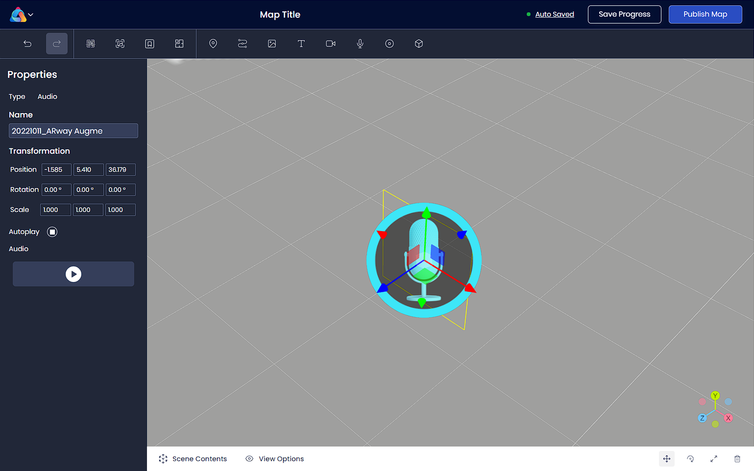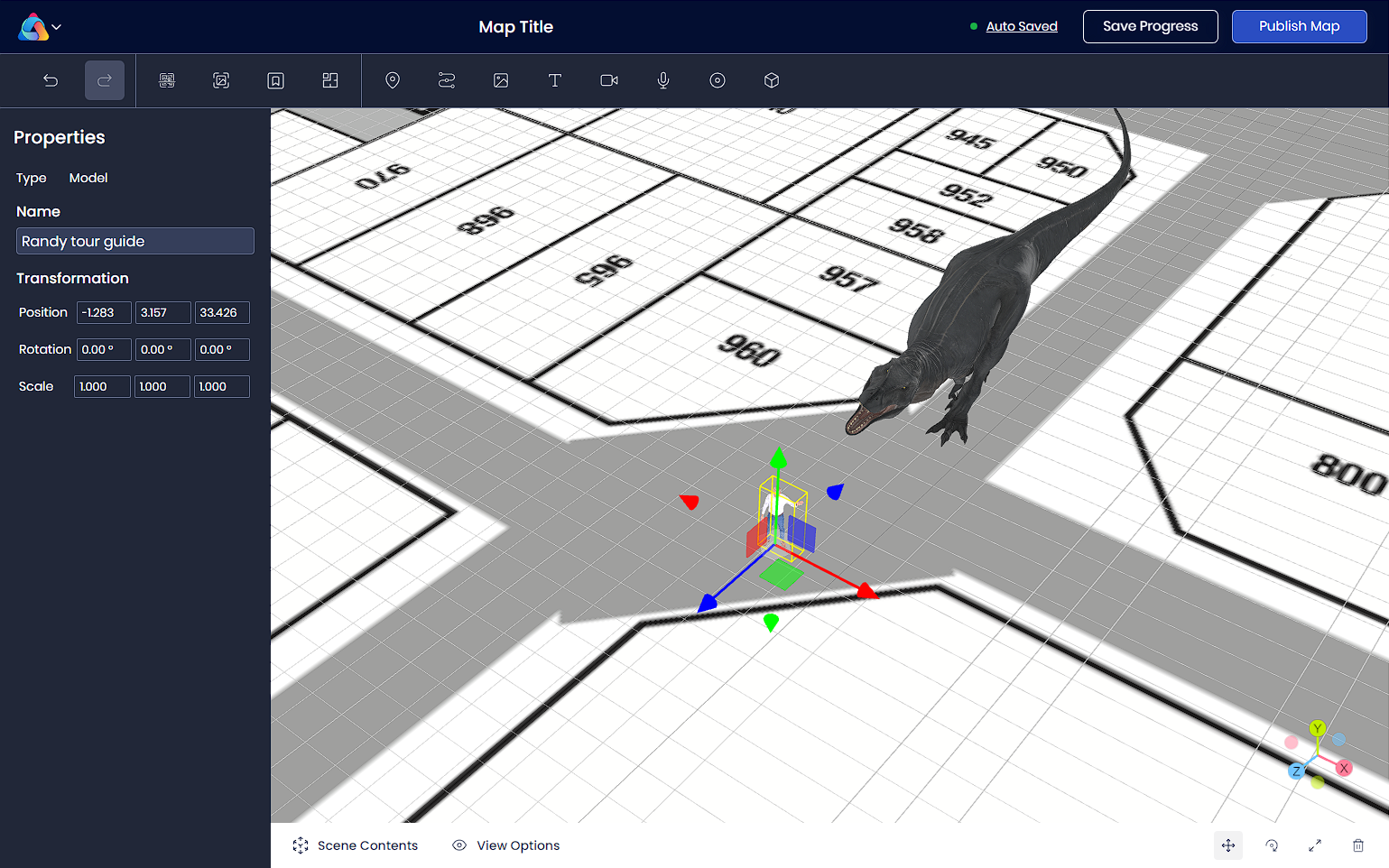 Users can save their progress or publish their map for others to scan using the "Save" or "Publish Map" button located at the top right. The "Scene Options" and "View Options" buttons in the bottom left allow the user to toggle the visibility of the map content and content types. On the bottom right, the three-axis indicator is used to show the current orientation of the camera viewing the map.