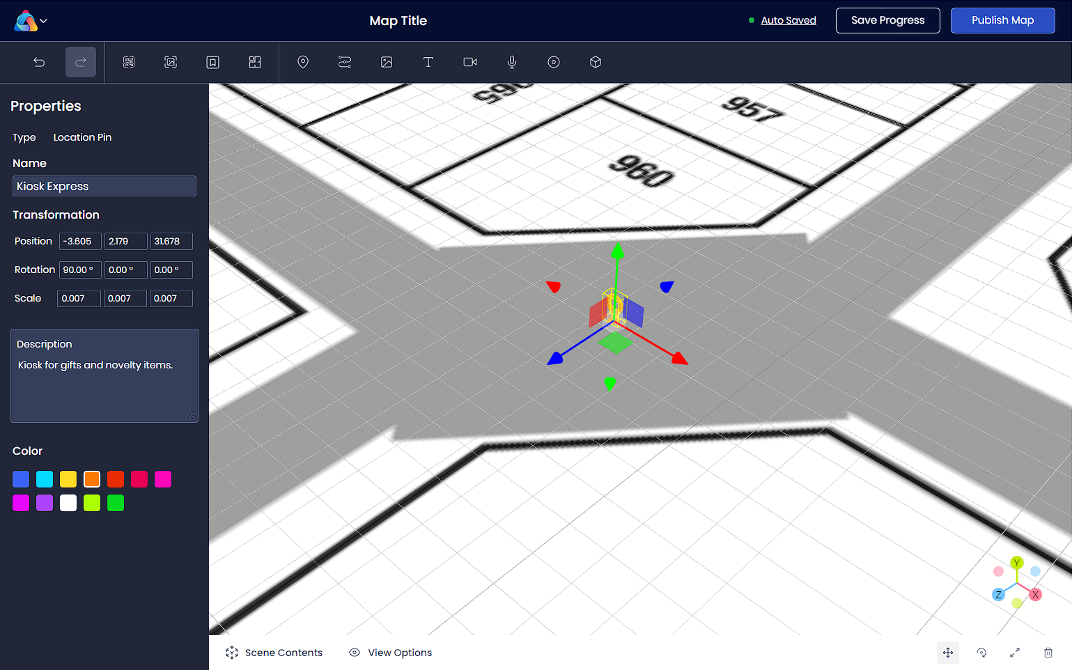 To anchor a 3D model to your map, simply select your desired model from the existing library or upload your own 3D model (.glb file format). Once added, transform, rotate, and scale the 3D model within the map as you’d like with reference to the floor plan and mapping path for accurate placement.